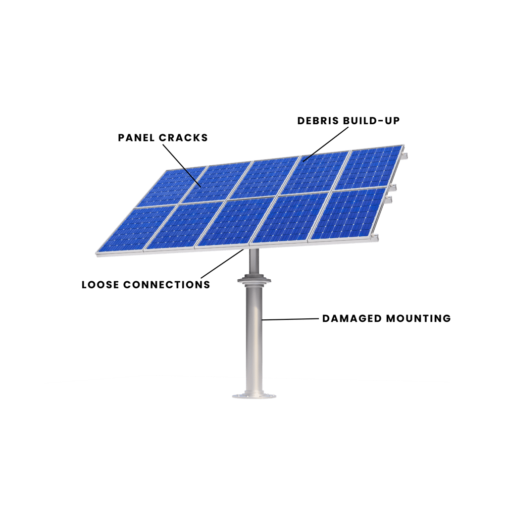 Debris & Shading Issues — leaves, dirt, bird activity, or nearby obstructions reducing efficiency.